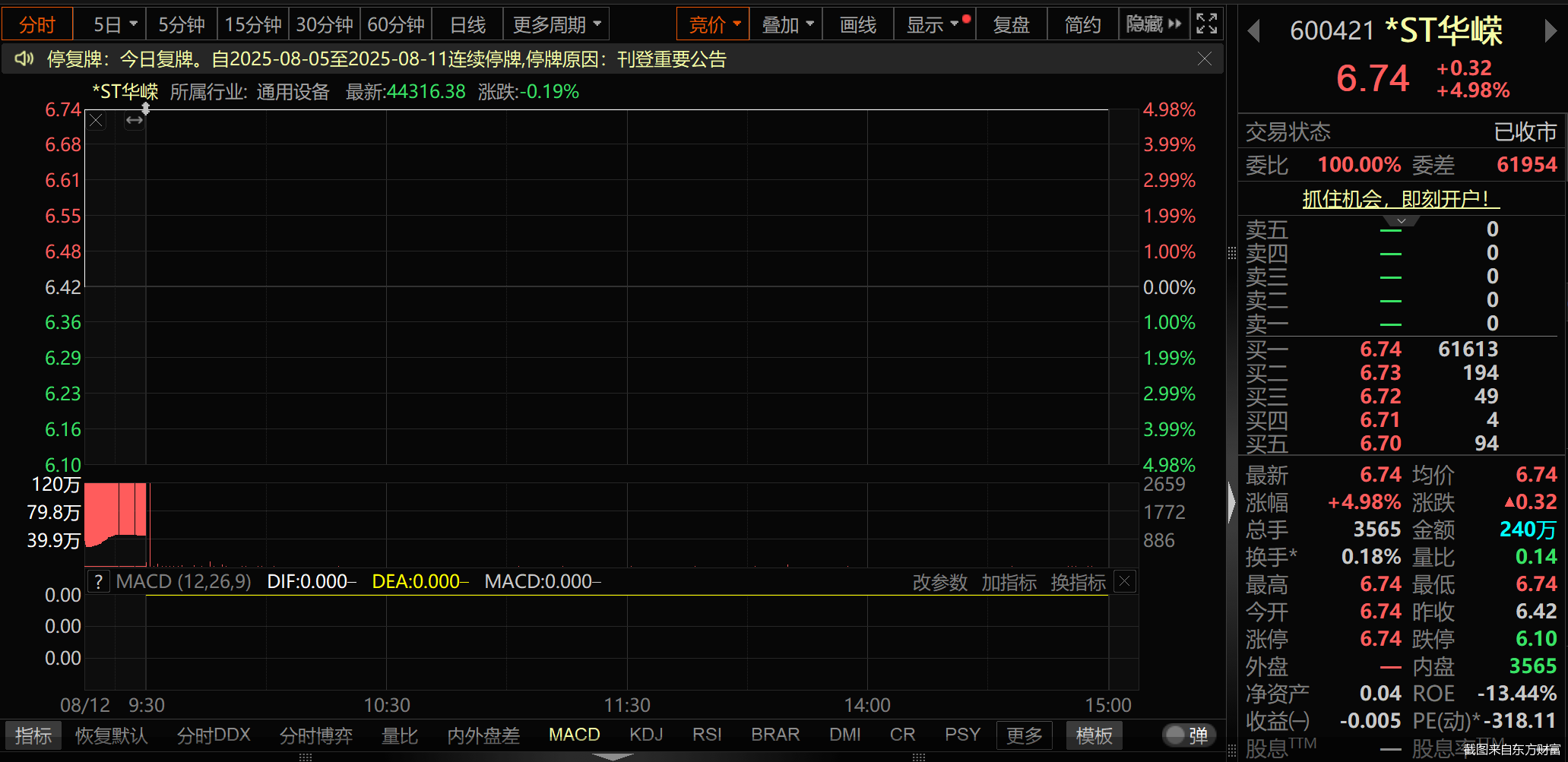 8月12日,*ST华嵘“一”字涨停,截止收盘,公司股价报6.74元/股,成交金额约240万元,总市值约13.18亿元。